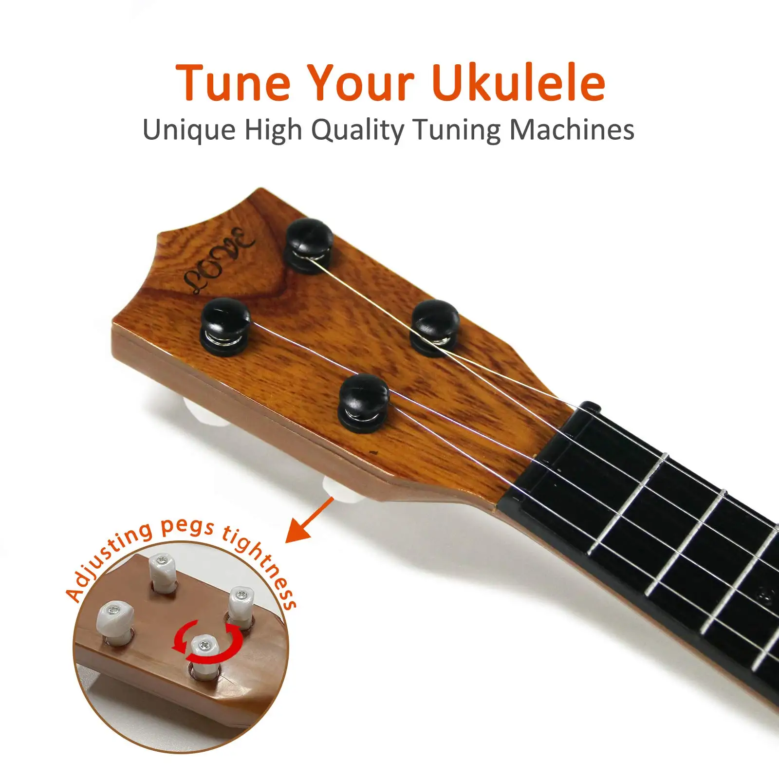 the toy ukulele is made of safe and environmentally friendly ABS plastic, wooden color; the surface coating is designed to prevent finger injuries; 4 ukulele strings, not easy to break. enjoy crystal-clear sound with this awesome toy ukulele and feel can stimulate children learn actively.